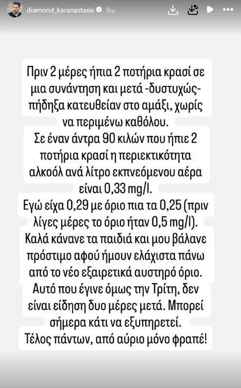 «Από αύριο μόνο φραπέ» γράφει ο Διαμαντής Καραναστάσης στην πρώτη του ανάρτηση στα Social Media, αφότου του επιβλήθηκε πρόστιμο για οδήγηση υπό την επήρεια αλκοόλ .