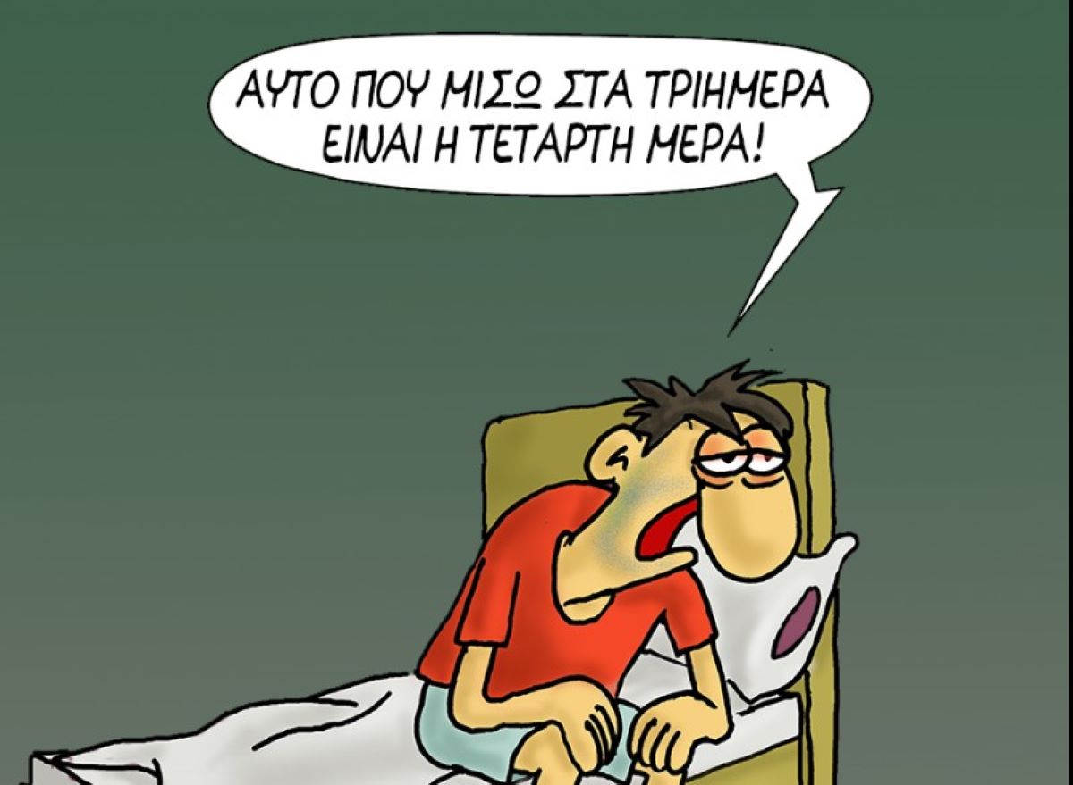 Στο σκίτσο βλέπουμε έναν αγουροξυπνημένο κύριο να λέει: «Αυτό που μισώ στα τριήμερα είναι η Τέταρτη μέρα!».