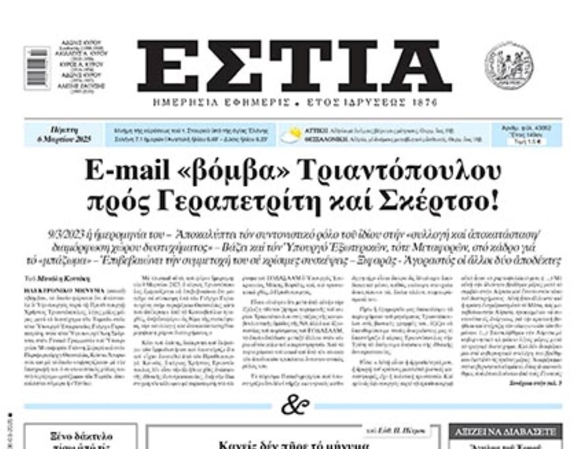 Ως «βαθιά παραπλανητικό» χαρακτηρίζουν κυβερνητικές πηγές το δημοσίευμα της εφημερίδας «Εστία», το οποίο αναφέρεται σε email που φέρεται να έστειλε ο τότε υφυπουργός Κλιματικής Κρίσης, Χρήστος Τριαντόπουλος, στον τότε υπουργό Επικρατείας, Γιώργο Γεραπετρίτη και στον τότε υφυπουργό, Άκη Σκέρτσο, με το οποίο σύμφωνα με την εφημερίδα δείχνει το συντονιστικό του ρόλο στο «μπάζωμα» των Τεμπών.