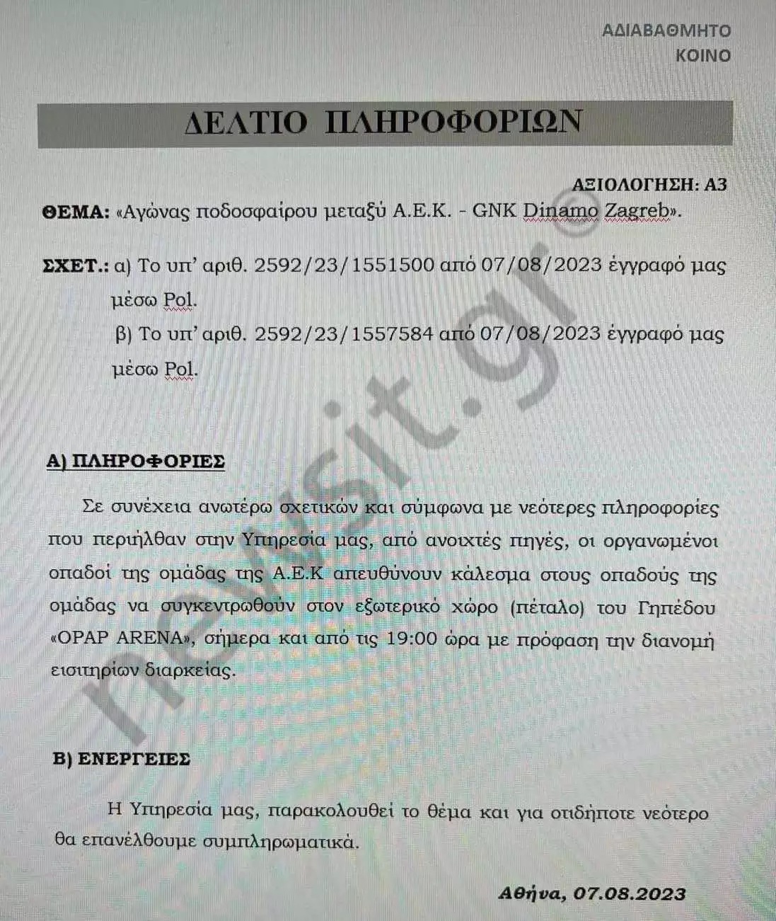 Την επόμενη μέρα και ειδικότερα στις 7 Αυγούστου 2023, σε δεύτερο Δελτίο Πληροφοριών με θέμα «Αξιολόγηση: Α3. Αγώνας ποδοσφαιρου μεταξυ ΑΕΚ – GΝΚ Dinamo Zagreb και επισυναπτόμενα εγγραφα απο το συστημα POL. με αριθμούς το υπ’ 2592 / 23 / 155 1500 από 7/8/ 2023 και 2592 / 23 / 155 7584 από 7/8/ 2023, που εχει στη διάθεση του το NewsIT, αναφέρονται τα εξής: «Σε συνέχεια ανωτέρω σχετικών και σύμφωνα με νεότερες πληροφορίες που περιήλθαν στην υπηρεσία μας από ανοιχτές πηγές, οι οργανωμένοι οπαδοί της ομάδας της ΑΕΚ , απευθύνουν κάλεσμα στους οπαδούς της ομάδας να συγκεντρωθούν στον εξωτερικό χώρο — πέταλο – του γηπέδου OPAP ARENA σήμερα και από τις 19:00 ώρα με πρόφαση την διανομή εισιτηρίων διαρκείας».