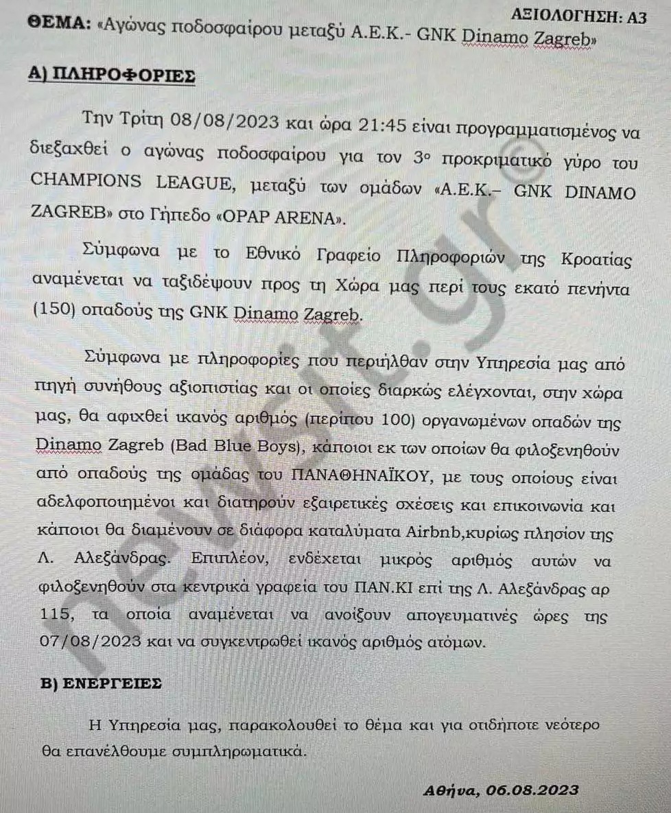 Στο πρώτο απόρρητο Ενημερωτικό Σημείωμα που αποκαλύπτει το newsit.gr, οι έμπειροι αξιωματικοί του Τμήματος Καταπολέμησης Αθλητικής Βίας που φέρει με ημερομηνία 6/8/ 2023, τίτλο: Αξιολόγηση: Α3 και θέμα: Αγώνας ποδοσφαιρου μεταξυ ΑΕΚ – GΝΚ Dinamo Zagreb επισημαίνουν τα εξής αναφορικά με τις πληροφορίες που ελαβαν απο τις ξένες αρχές: «Την Τρίτη 8/8/ 2023 και ώρα 21:45, είναι προγραμματισμένος να διεξαχθεί ο αγώνας ποδοσφαίρου για τον 3ο προκριματικό γύρο του Champions League μεταξύ ομάδων ΑΕΚ – GΝΚ Dinamo Zagreb στο γήπεδο OPAP ARENA. Σύμφωνα με το Εθνικό Γραφείο Πληροφοριών της Κροατίας, αναμένεται να ταξιδέψουν προς την χώρα μας περί τους 150 οπαδούς της GΝΚ Dinamo Zagreb. Σύμφωνα με πληροφορίες που περιήλθαν στην υπηρεσία μας από πηγή συνήθους αξιοπιστίας και οι οποίες διαρκώς ελέγχονται, στην χώρα μας θα αφιχθή ικανός αριθμός περίπου – 100 οργανωμένων οπαδών της GΝΚ Dinamo Zagreb – BAD BLUE BOYS- κάποιοι εκ των οποίων θα φιλοξενηθούν από οπαδούς της ομάδας του Παναθηναϊκού με τους οποίους είναι αδελφοποιημένοι και διατηρούν εξαιρετικές σχέσεις και επικοινωνία και κάποιοι θα διαμένουν σε διάφορα καταλύματα Airbnb κυρίως πλησίον της λεωφόρου Αλεξάνδρας. Επιπλέον ενδέχεται μικρός αριθμός αυτών να φιλοξενηθούν στα κεντρικά γραφεία του ΠΑΝ.ΚΙ επί της Λ. Αλεξάνδρας αριθμός 115 τα οποία αναμένεται να ανοίξουν απογευματινές ώρες 7/8/2023 και να συγκεντρωθεί ικανός αριθμός ατόμων. Ενέργειες: υπηρεσία μας παρακολουθεί το θέμα και για οποιοδήποτε νεότερο θα επανέλθουμε συμπληρωματικά».
