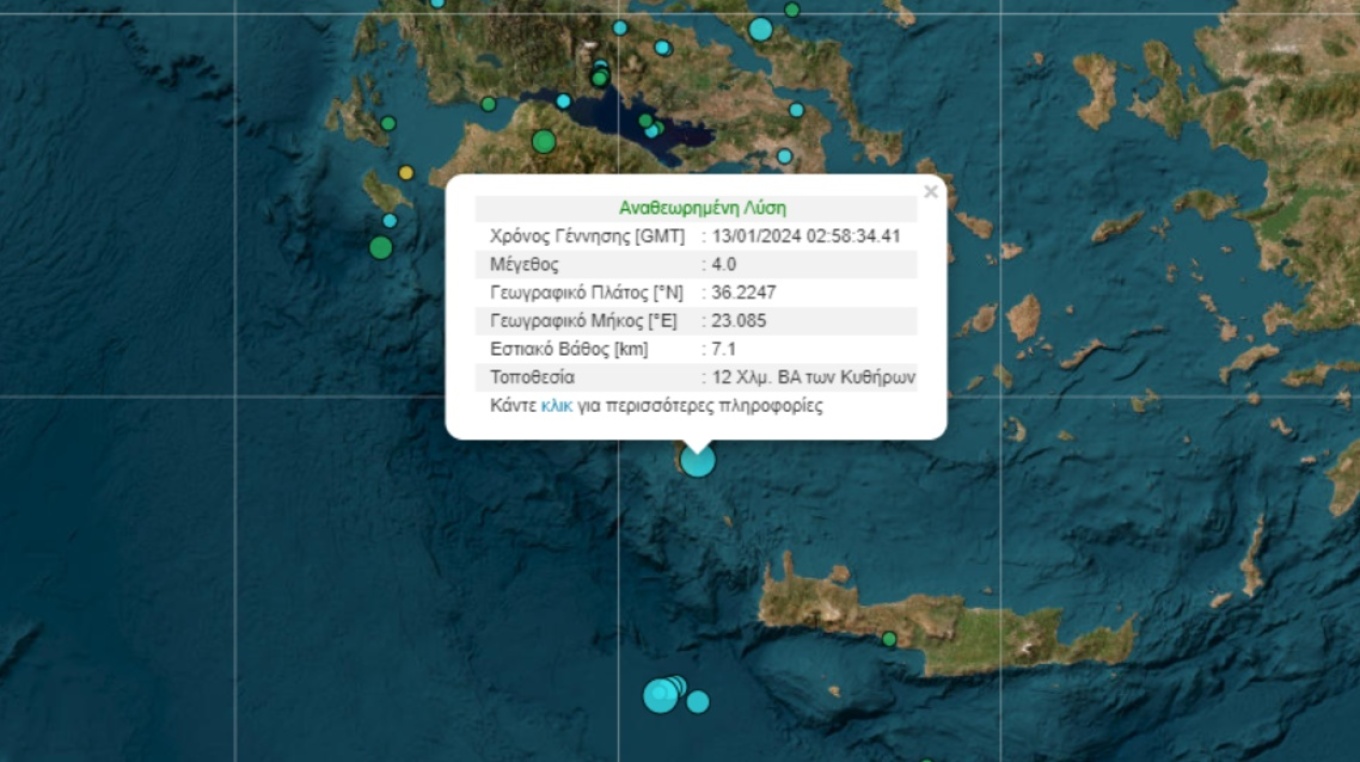 Αναλυτικότερα, σεισμός μεγέθους 4 βαθμών στην κλίμακα Ρίχτερ σημειώθηκε στις 04:58 στα Κύθηρα, όπως αναφέρει το Γεωδυναμικό Ινστιτούτο του Εθνικού Αστεροσκοπείου Αθηνών.