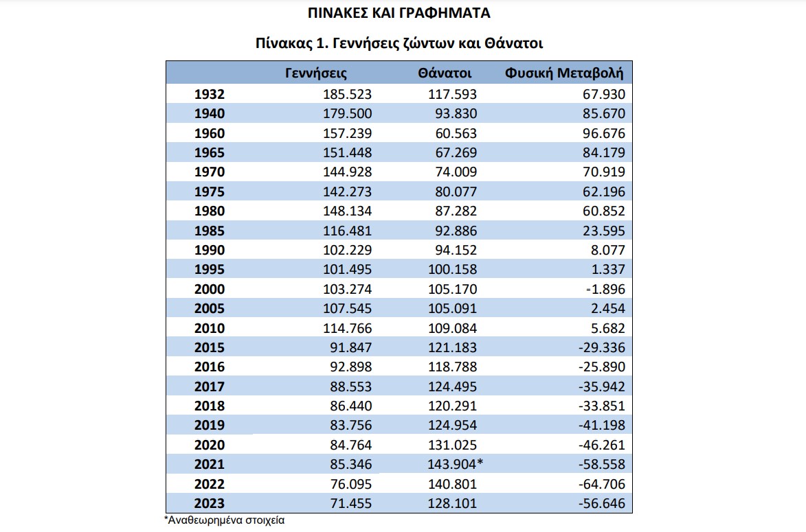 Σύμφωνα με τα παραπάνω, οι γεννήσεις στην Ελλάδα κατά το 2023 ανήλθαν σε 71.455 (36.622 αγόρια και 34.833 κορίτσια) καταγράφοντας μείωση κατά 6,1% σε σχέση με το 2022 που ήταν 76.095 (39.305 αγόρια και 36.790 κορίτσια). Στις γεννήσεις δεν συμπεριλαμβάνονται οι γεννήσεις νεκρών, οι οποίες κατά το 2023 ανήλθαν σε 432, μειωμένες κατά 3,1% σε σχέση με το 2022 που ήταν 446.