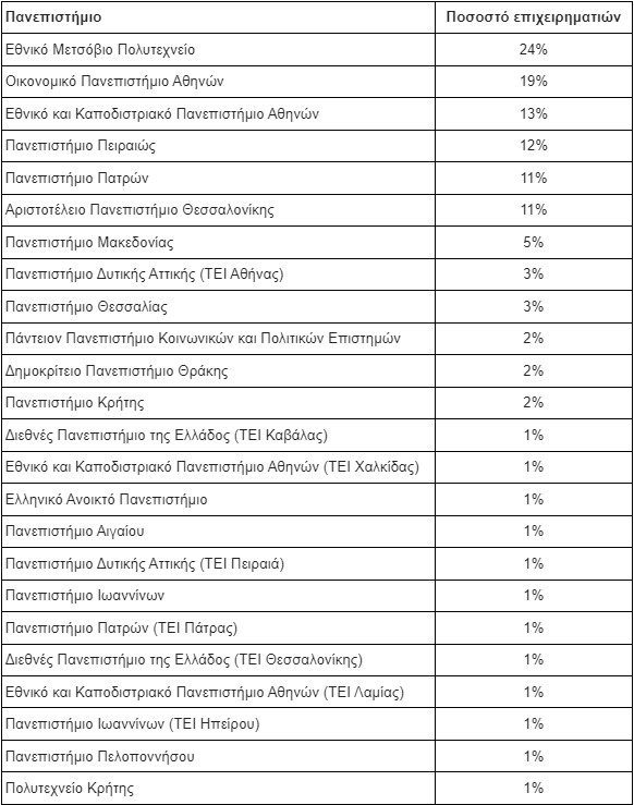 Έρευνα: Ποια ελληνικά πανεπιστήμια παράγουν τους περισσότερους επιχειρηματίες, CEOs & startup founders