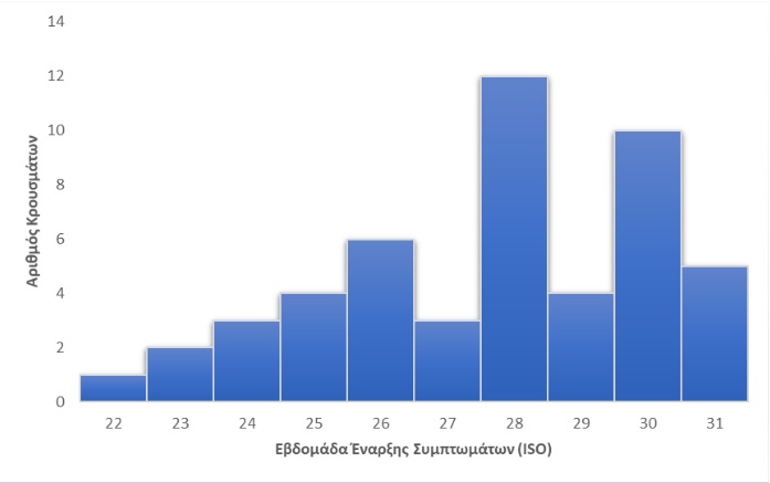 Ο συνολικός αριθμός των εργαστηριακά επιβεβαιωμένων κρουσμάτων από την έναρξη της καταγραφής ανέρχεται σε 50 (όλοι άνδρες, διάμεση ηλικία: 36 έτη (19-59), εκ των οποίων 16 ανέφεραν ταξίδι στο εξωτερικό εντός του χρόνου επώασης της νόσου (32%). Η χρονική κατανομή των εργαστηριακά επιβεβαιωμένων κρουσμάτων ανά εβδομάδα έναρξης συμπτωμάτων (εβδομάδα κατά ISO) παρουσιάζεται στο Γράφημα 1.