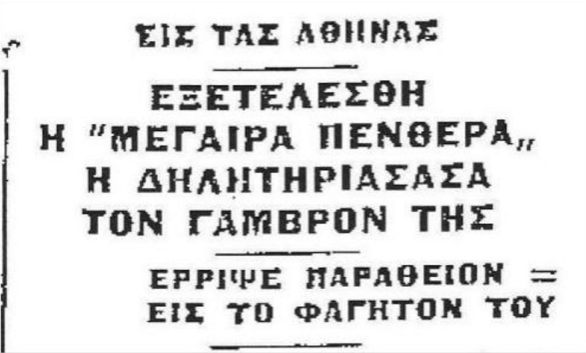 Στο βιβλίο του με τίτλο «Εγκλήματα Γένους Θηλυκού στην Ελλάδα» γράφει ο Πάνος Σόμπολος: «Όταν τη ρωτήσαμε στην Αστυνομία για το έγκλημά της, απάντησε: “Μας έκανε ρεζίλι σ’ όλο το χωριό. Έπρεπε να ξεπλύνω τον λεκέ…”».