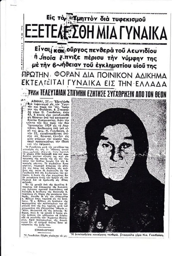 Η δράστιδα καταδικάζεται σε θανατική ποινή και γίνεται η πρώτη γυναίκα που εκτελείται σε μία από τις πλέον εμβληματικές υποθέσεις ενδοοικογενειακής βίας της μεταπολεμικής Ελλάδας.