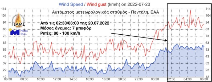 Με βάση το δίκτυο αυτόματων μετεωρολογικών σταθμών του ΕΑΑ / meteo.gr, οι βόρειοι άνεμοι στην περιοχή της πυρκαγιάς ενισχύθηκαν σημαντικά από τις πρώτες πρωινές ώρες (02:30/03:00) της Τετάρτης 20.07.2022, πνέοντας μέχρι αυτή τη στιγμή (20.07.2022, 07:00) με μέσες εντάσεις που φτάνουν τα 7 μποφόρ και ριπές που ξεπερνούν τα 90-100 km/h.