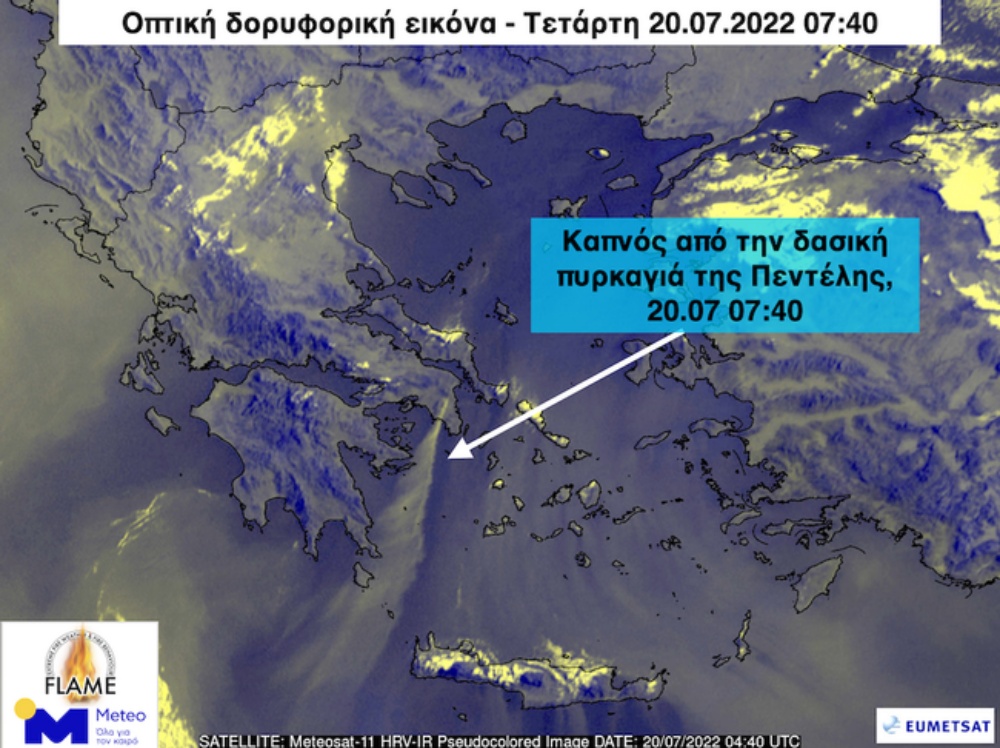 Οπτική δορυφορική εικόνα που έλαβε και επεξεργάστηκε το Εθνικό Αστεροσκοπείο Αθηνών/meteo.gr από τον Ευρωπαϊκό δορυφόρο METEOSAT-11, δείχνει τον καπνό της δασικής πυρκαγιάς της Πεντέλης να έχει μεταφερθεί από τους ισχυρούς βόρειους-βορειοανατολικούς ανέμους τουλάχιστον 400 χιλιόμετρα νότια-νοτιοδυτικά προς την θάλασσα των Κυθήρων και το Νοτιοδυτικό Κρητικό Πέλαγος το πρωί της Τετάρτης 20.07.2022 07:40.