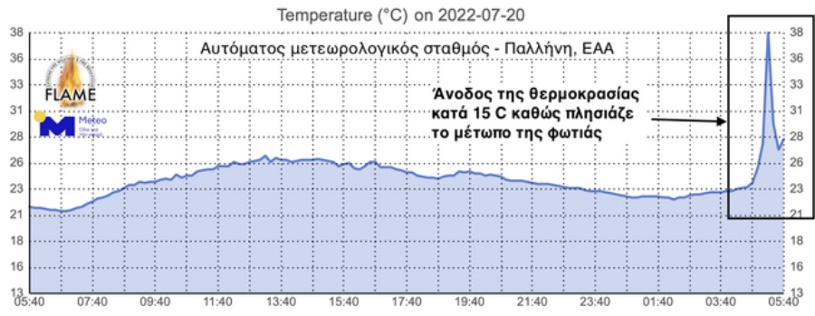 Από τις καταγραφές του αυτόματου μετεωρολογικού σταθμού του ΕΑΑ / meteo.gr στην Παλλήνη, προκύπτει απότομη άνοδος της θερμοκρασίας κατά 15 βαθμούς Κελσίου την ώρα που το μέτωπο της φωτιάς πλησίαζε την περιοχή. Ειδικότερα, η θερμοκρασία μεταξύ 04:40 και 05:10 (20.07.2022), εντός δηλαδή 30 λεπτών, ανέβηκε από τους 23 στους 38 βαθμούς Κελσίου.