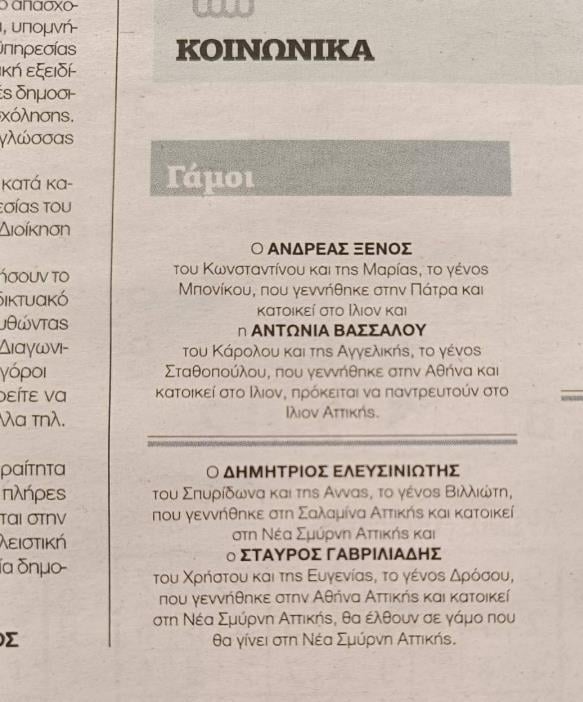 Δημοσιεύθηκε το πρωί της Παρασκευής, μία ημέρα μετά την υπερψήφιση του νομοσχεδίου για την ισότητα στον πολιτικό γάμο με 176 «ναι», η πρώτη αγγελία για γάμο ομόφυλου ζευγαριού στην Ελλάδα.