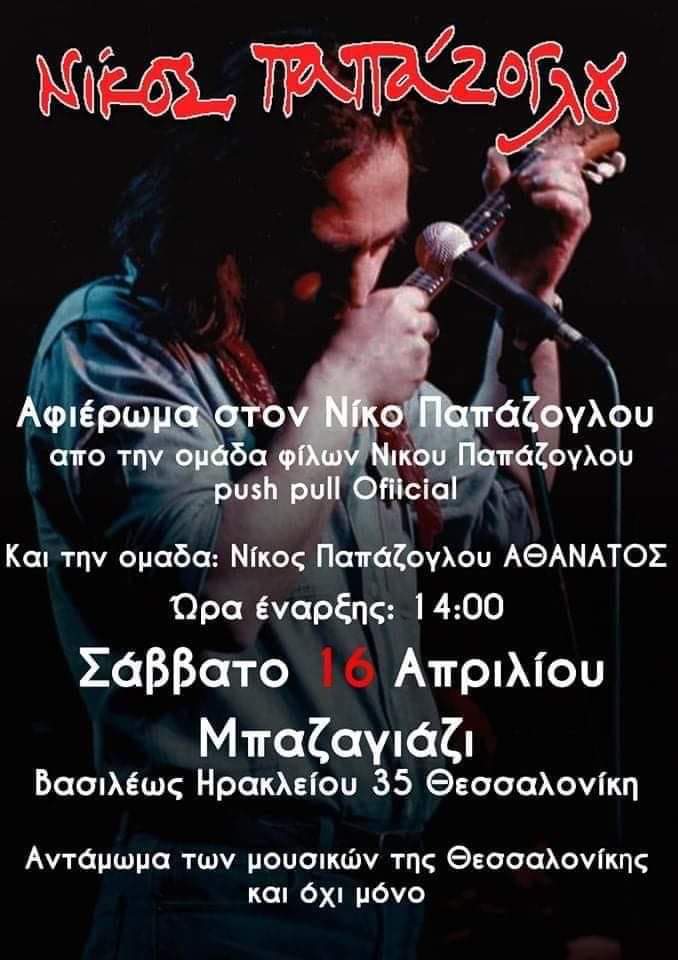 Φίλες και φίλοι μουσικοί, αν αισθάνεστε την ανάγκη να βρεθείτε μαζί μας στην ετήσια μάζωξη/αφιέρωμα στον αξέχαστο καλλιτέχνη της Θεσσαλονίκης Νίκο Παπάζογλου, πάρτε το όργανο ή τη φωνή σας, και ελάτε να τιμήσουμε παίζοντας, τραγουδώντας και χορεύοντας ακόμη, γιατί όχι, τη μνήμη του μεγάλου και αγαπημένου Νικόλα !