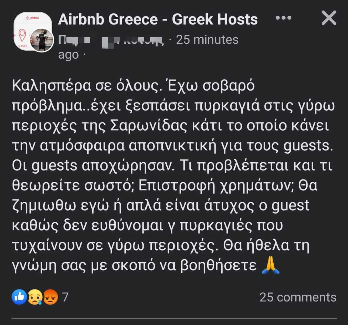 «Καλησπέρα, έχω σοβαρό πρόβλημα. Έχει ξεσπάσει πυρκαγιά στις γύρω περιοχές της Σαρωνίδας κάτι το οποίο κάνει την ατμόσφαιρα αποπνικτική για τους guests. Οι guests αποχώρησαν. Τι προβλέπεται και τι θεωρείτε σωστό; Επιστροφή χρημάτων; Θα ζημιωθώ εγώ ή απλά είναι άτυχος ο guest καθώς δεν ευθύνομαι για πυρκαγιές που τυχαίνουν σε γύρω περιοχές. Θα ήθελα την γνώμη σας με σκοπό να βοηθήσετε».