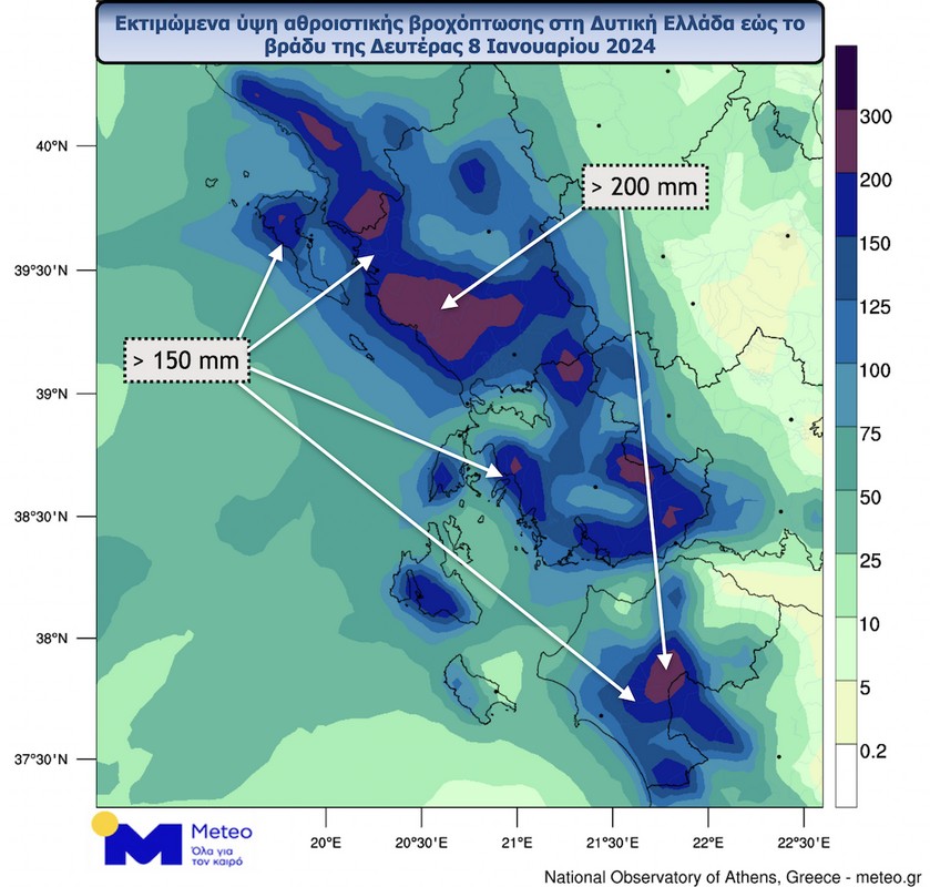 Σύμφωνα με το meteo.gr το επεισόδιο βροχόπτωσης κατατάσσεται στην Κατηγορία 4 (Πολύ Σημαντική). Τα ύψη της βροχής που αναμένεται έως τις βραδινές ώρες της Δευτέρας 08/01 στη χώρα μας και στη Δυτική Ελλάδα.