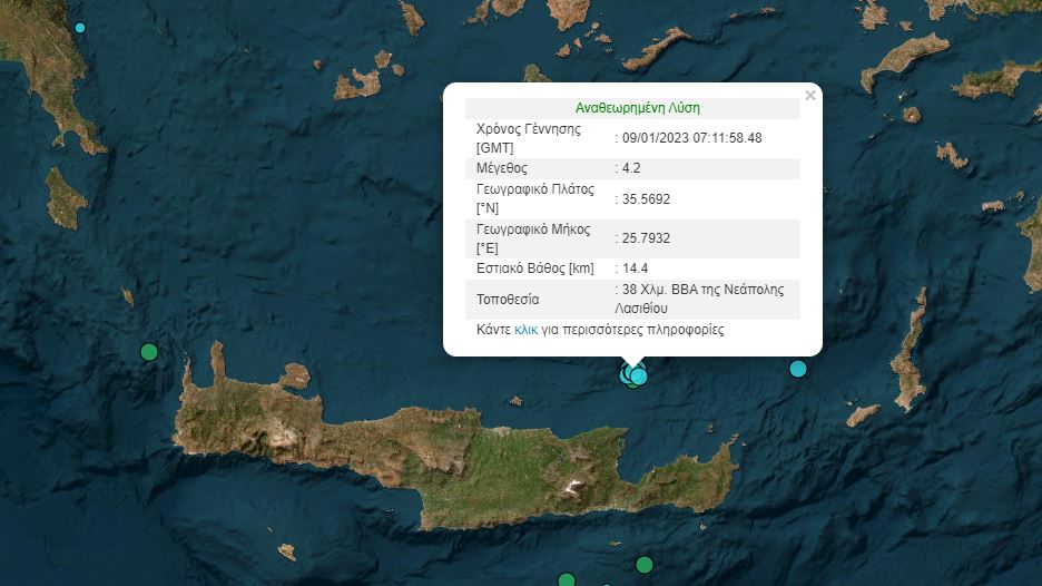 Σύμφωνα με το Γεωδυναμικό Ινστιτούτο το επίκεντρο του νέου σεισμού εντοπίζεται 38 χιλιόμετρα βόρεια βορειοανατολικά της Νεάπολης Λασιθίου και το εστιακό του βάθος στα 14,8 χιλιόμετρα.