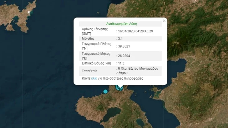 Πιο αναλυτικά και σύμφωνα με το Γεωδυναμικό Ινστιτούτο, το εστιακό βάθος υπολογίζεται στα 11,3 χλμ, ενώ το επίκεντρο της δόνησης εντοπίζεται στα 6 χλμ. βορειοδυτικά του Μανταμάδου.