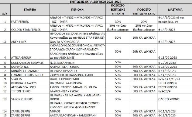 Ανακοινώνονται εκπτώσεις έως και 50% στα ακτοπλοϊκά των αναπληρωτών εκπαιδευτικών. Η έκπτωση θα αφορά στην κάλυψη των μετακινήσεων των εκπαιδευτικών από τους μόνιμους τόπους κατοικίας τους προς το τελικό νησί, στο οποίο ανέλαβαν υπηρεσία. Πιο συγκεκριμένα, οι εκπτώσεις ανά εταιρεία διαμορφώνονται ως ακολούθως: