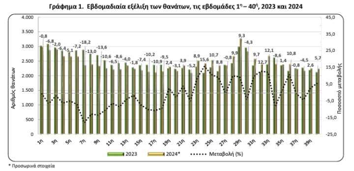 Σύμφωνα με τα στοιχεία της ΕΛΣΤΑΤ, μείωση κατά 3.071 θανάτους (3,1%) σημειώθηκε σε σχέση με τον μέσο όρο των συνολικών θανάτων κατά τις πρώτες 40 εβδομάδες των ετών της περιόδου 2018-2023 (100.268 θάνατοι). Τα αντίστοιχα ποσοστά μεταβολής, ανά έτος, για την περίοδο 2018- 2023 ανέρχονται σε -9,9% το 2023 σε σχέση με το 2022 (109.595 θάνατοι), σε 1,9% το 2022 σε σχέση με το 2021 (107.511 θάνατοι), σε 10,4% το 2021 σε σχέση με το 2020 (97.365 θάνατοι), σε 0,5% το 2020 σε σχέση με το 2019 (96.883 θάνατοι) και σε 5,9% το 2019 σε σχέση με το 2018 (91.487 θάνατοι).