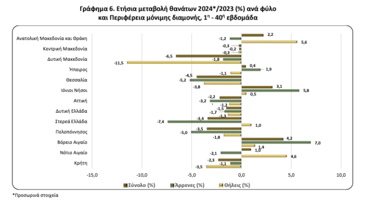 Κατά 1,6% μειώθηκαν οι θάνατοι τις πρώτες 40 βδομάδες του 2024, σε σχέση με την ίδια χρονική περίοδο του 2023, σύμφωνα με στοιχεία της ΕΛΣΤΑΤ.