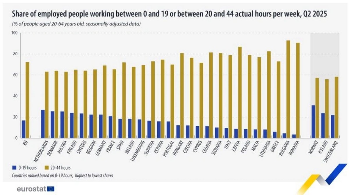 Το 72,3% των εργαζομένων στην Ε.Ε. εργάζεται μεταξύ 20 και 44 ωρών εβδομαδιαίως, ενώ στην Ελλάδα μόλις το 6,1% εργάζεται λιγότερο από 19 ώρες, ένδειξη περιορισμένης μερικής απασχόλησης.