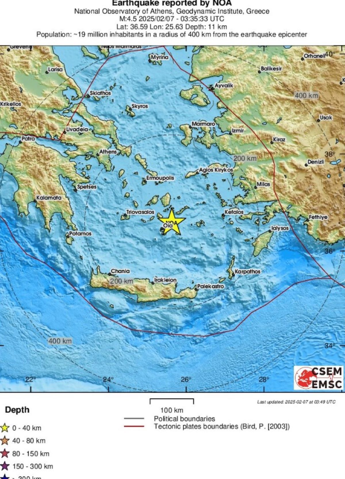 Σεισμός 4,5 Ρίχτερ, σύμφωνα με την αυτόματη λύση τους EMSC, σημειώθηκε τα ξημερώματα της Παρασκευής, στις 05:35 στο θαλάσσιο χώρο στα ανοιχτά της Σαντορίνης νότια της Αμοργού, άλλη μια 3,8 Ρίχτερ στις 04:10 τα ξημερώματα με επίκεντρο 20 χλμ. νότια νοτιοδυτικά της Αρκεσίνης Αμοργού. Άλλοι έξι ασθενείς σεισμοί, από 3,2 έως 3,7 Ρίχτερ ο μεγαλύτερος, σημειώθηκαν μέσα σε μια ώρα, από τις 12:59 τα μεσάνυχτα έως τις 01:41 με ίδιο επίκεντρο.