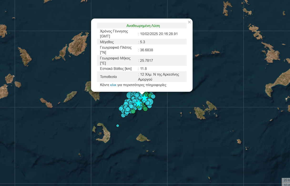 Στις 21:05 το βράδυ της Κυριακής, ο Εγκέλαδος χτύπησε με 5 Ρίχτερ στη θαλάσσια περιοχή, νοτιοδυτικά της Αμοργού, ενώ στις 13:23 το μεσημέρι της Δευτέρας (10/2), κατεγράφη δόνηση 4,9 βαθμών, που έγινε αισθητή και στην Αττική.