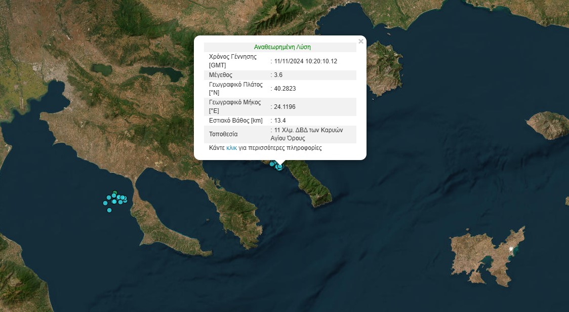 Σύμφωνα με το γεωδυναμικό ινστιτούτο, ο σεισμός εντοπίζεται 11χλμ δυτικά βορειοδυτικά των Καρυών του Αγίου Όρους ενώ το εστιακό βάθος στα 13,4 χλμ.