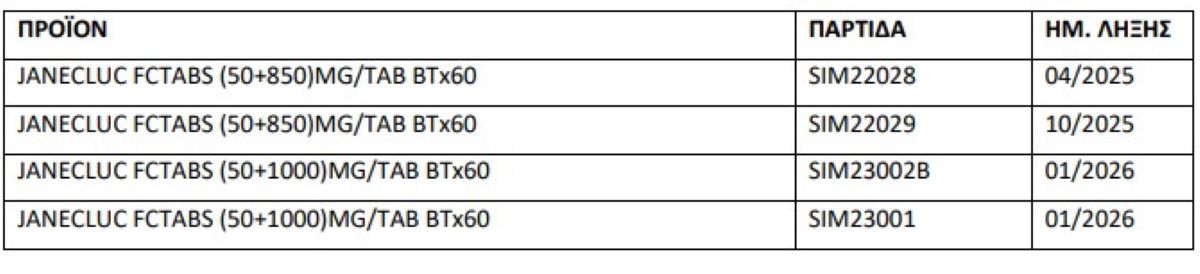 «Αποφασίζουμε την ανάκληση των παρτίδων του παραπάνω πίνακα, του φαρμακευτικού προϊόντος JANECLUC FCTABS (50+850)MG/TAB BTx60 και JANECLUC FCTABS (50+1000)MG/TAB BTx60, λόγω αποτελεσμάτων εκτός προδιαγραφών κατά τον έλεγχο νιτροζαμινών στο πλαίσιο ελέγχων σταθερότητας», αναφέρει ο ΕΟΦ.