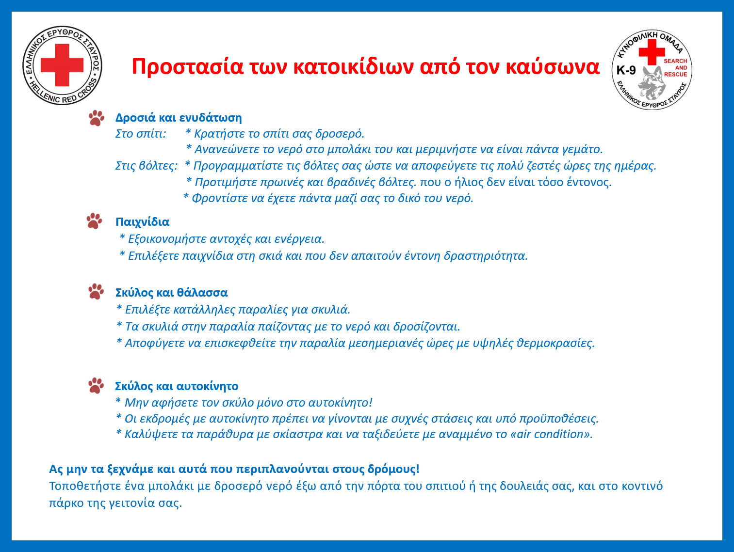 Συγκεκριμένα, η Κυνοφιλική Ομάδα Έρευνας & Διάσωσης του Τομέα Σαμαρειτών-Διασωστών & Ναυαγοσωστών του Ε.Ε.Σ. προτείνει απλές μεθόδους που αφενός θα προστατεύσουν τα κατοικίδια από τον καύσωνα και αφετέρου θα διατηρήσουν τη διάθεσή τους σε υψηλά επίπεδα.