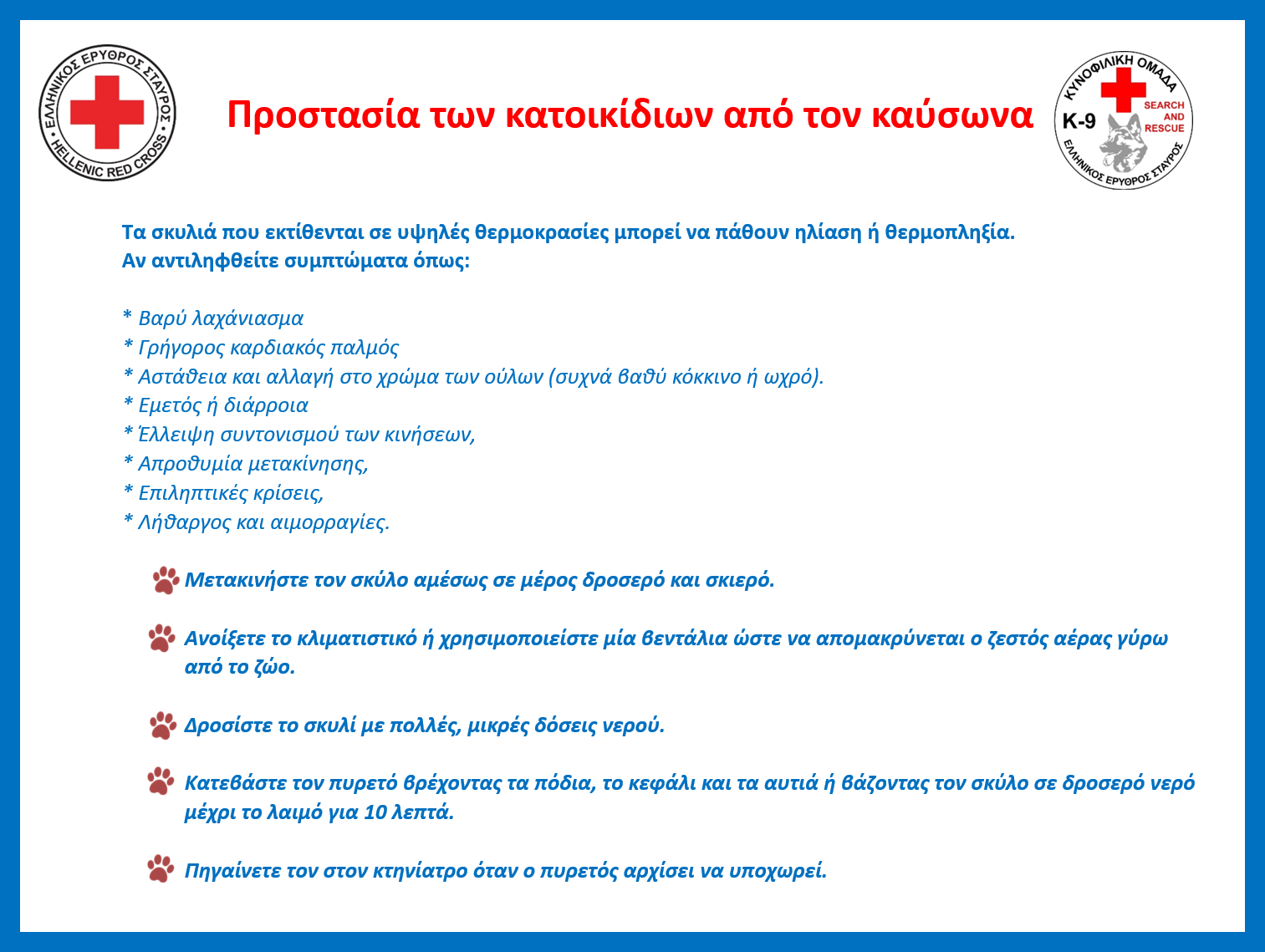 Χρήσιμες συμβουλές για τους ιδιοκτήτες κατοικιδίων ενόψει του καύσωνα δίνει ο Ελληνικός Ερυθρός Σταυρός.