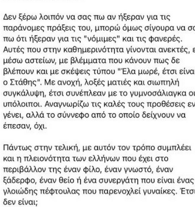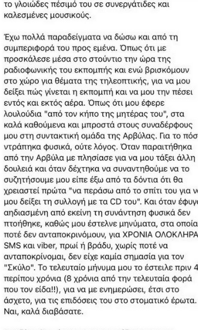 «Ήξεραν ότι ο εν λόγω τύπος είναι ένας γλοιώδης παρενοχλητής. Ήξεραν ότι την πέφτει σε ό,τι κινείται, προχωρώντας άμεσα και σε κινήσεις – χοντράδες αν τυχόν η εκάστοτε κοπέλα προσπαθούσε να αρνηθεί με ευγενικό τρόπο. Ήξεραν όλοι ότι παρενοχλούσε τα κορίτσια στο γραφείο, στο στούντιο, όπου στεκόταν κι όπου βρισκόταν. Φαίνεται βέβαια και στην ίδια την εκπομπή όλα αυτά τα χρόνια πως είναι αποδεκτό από τους υπόλοιπους το γλοιώδες πέσιμό του σε συνεργάτιδες και καλεσμένες μουσικούς», σημειώνει μεταξύ άλλων.