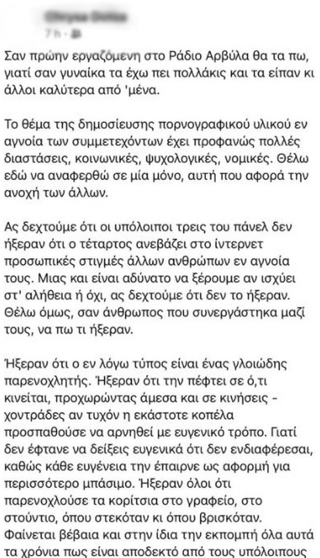 Μέσω των social media μια πρώην εργαζόμενη στην εκπομπή των «Ράδιο Αρβύλα», μοιράστηκε την εμπειρία της από το διάστημα όπου βρισκόταν στην ομάδα, κατά το οποίο όπως λέει υπήρξε θύμα συχνής και στενής παρενόχλησης από τον Στάθη Παναγιωτόπουλο.