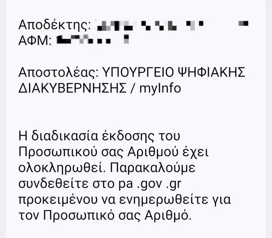 Τις τελευταίες ημέρες, χιλιάδες πολίτες έλαβαν ενημερωτικό email, με το οποίο ενημερώνονται ότι ο Προσωπικός Αριθμός τους έχει ήδη εκδοθεί και είναι πλέον διαθέσιμος στα προσωπικά τους στοιχεία.