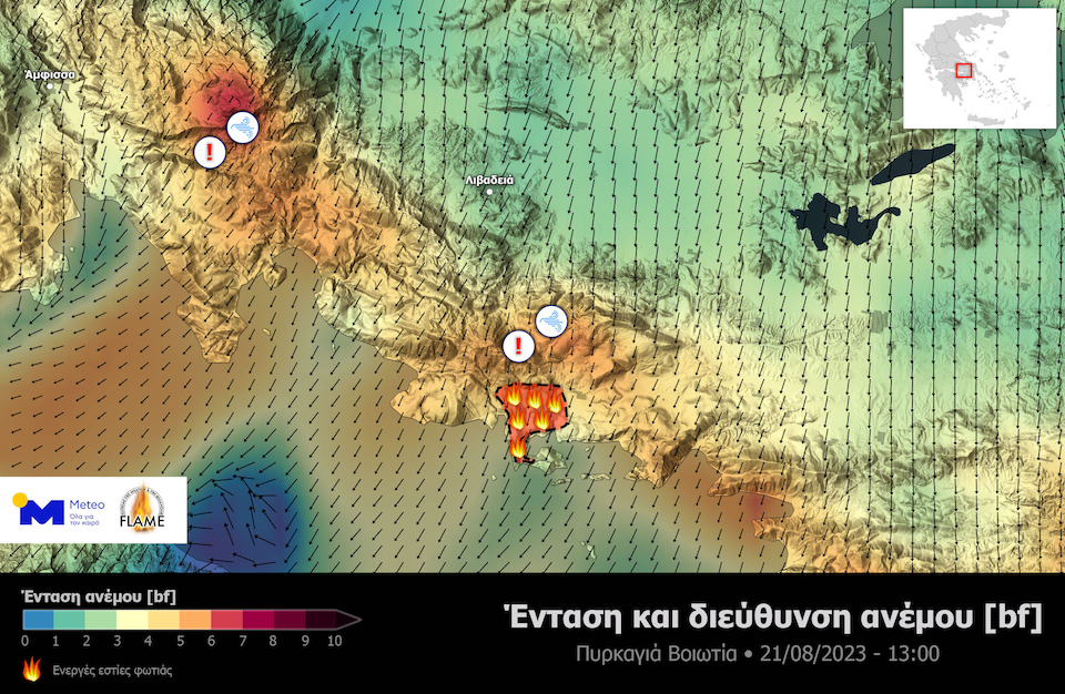Δυσμενείς και τις επόμενες ώρες, μέχρι αργά το βράδυ απόψε, θα παραμείνουν οι πυρομετεωρολογικές συνθήκες σε Έβρο και Βοιωτία όπου έχουν εκδηλωθεί δασικές πυρκαγιές, όπως προκύπτει από τα νεότερα προγνωστικά δεδομένα πολύ υψηλής ανάλυσης της μονάδας ΜΕΤΕΟ του Εθνικού Αστεροσκοπείου Αθηνών (ΕΑΑ).