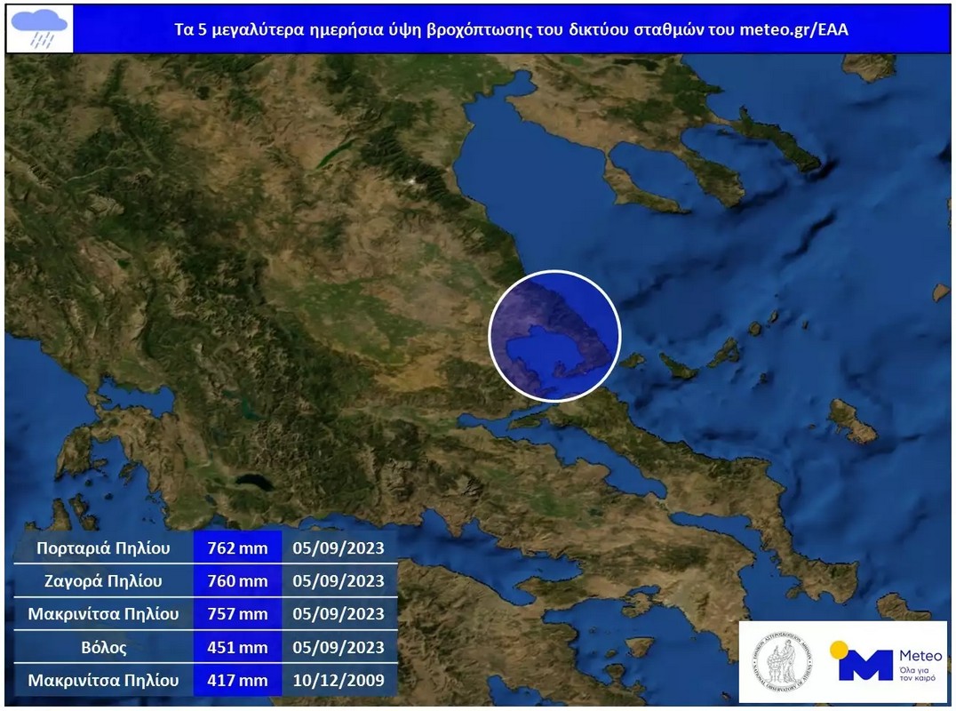 Μετά την κακοκαιρία Daniel την πρώτη θέση καταλαμβάνει η βροχόπτωση στην Πορταριά Πηλίου (762 χιλιοστά) και ακολουθούν η Ζαγορά Πηλίου (760 χιλιοστά), η Μακρινίτσα (757 χιλιοστά) και ο Βόλος (451 χιλιοστά).