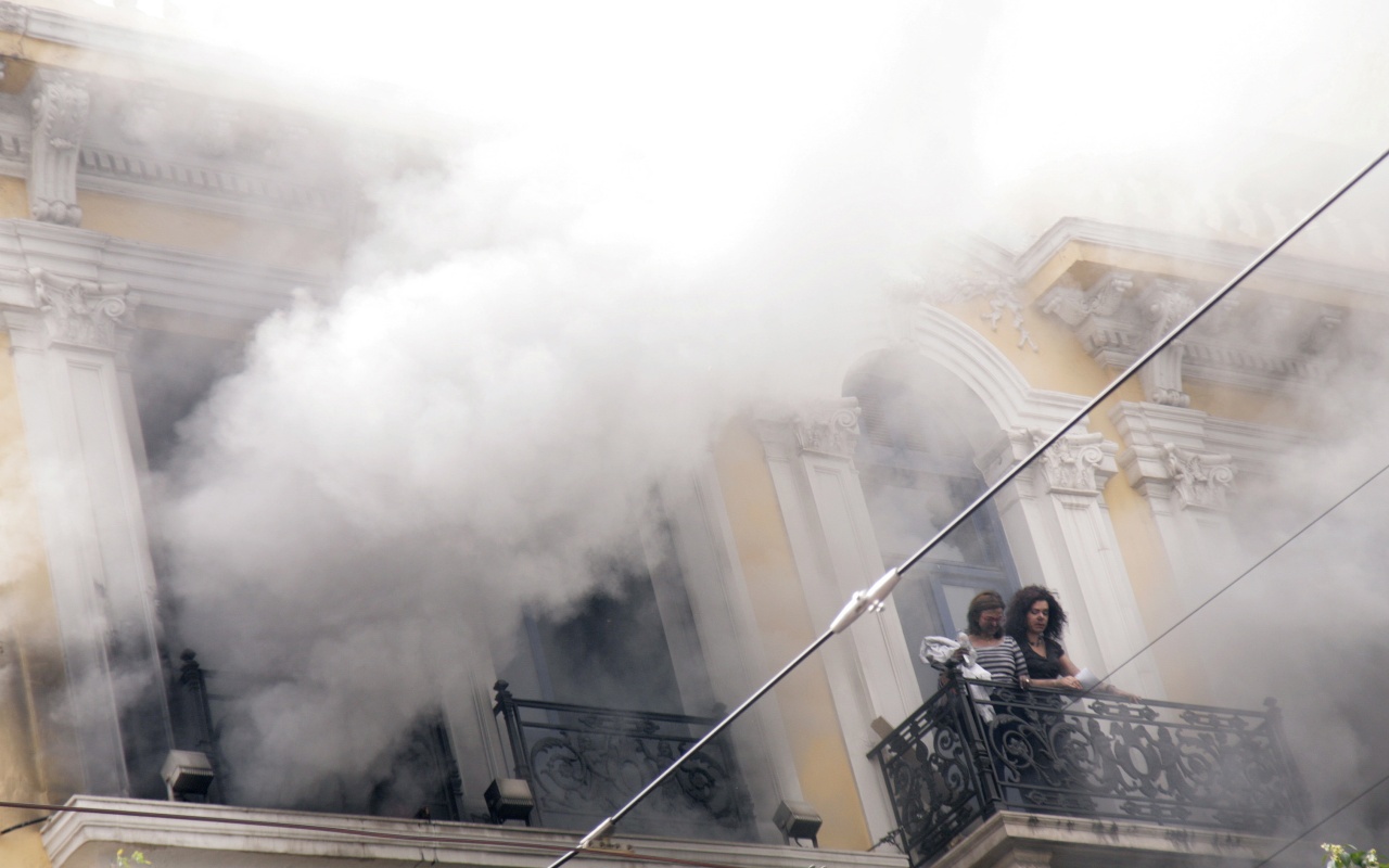 Σύντομα βαρύς καπνός τύλιξε όλο το υποκατάστημα. Οι περισσότεροι υπάλληλοι στοιβάχτηκαν στον μικρό φωταγωγό που επικοινωνούσε μέσω πλέγματος με την ταράτσα, το οποίο πλέγμα ένας εξ αυτών κατάφερε και έσπασε. Στη συνέχεια αναρριχήθηκαν από τον φωταγωγό στη στέγη, απ’ όπου πήδηξαν σε διπλανό κτίριο σπάζοντας τη τζαμαρία του με καδρόνι. Ακόμα και όταν το ισόγειο καιγόταν και κάποιοι υπάλληλοι για να σωθούν είχαν βγει στο μπαλκόνι του πρώτου ορόφου, ακούγονταν συνθήματα όπως «να καείτε ρε π…» και «κάψτε τους πλούσιους», ενώ αυτόπτης μάρτυρας κατέθεσε πως το συγκεντρωμένο πλήθος τους πετούσε πέτρες. Από την άλλη, μετανάστες που είχαν αφήσει το μπλοκ τους προσπαθούσαν να σπάσουν την πόρτα για απεγκλωβισμό, και το πλήθος διευκόλυνε τη διέλευση της Πυροσβεστικής.