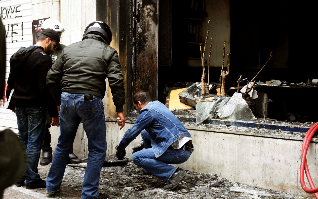 Ενώ η κύρια πορεία των διαδηλωτών ανέβαινε την οδό Σταδίου κατευθυνόμενη προς τη πλατεία Συντάγματος, περίπου στις 2 παρά πέντε μ.μ. η ομάδα κουκουλοφόρων επιτέθηκε στο κτίριο της Μαρφίν που βρισκόταν στον αριθμό 23. Αυτόπτης μάρτυρας ανέφερε ότι τρία άτομα με κουκούλες έσπασαν με 3-4 χτυπήματα τα τζάμια και πέταξαν μέσα μία μολότοφ και αμέσως μετά ένα μπουκάλι με βενζίνη. Είναι συνήθης πρακτική οι τζαμαρίες των τραπεζών να ενισχύονται με νοβοπάν για να καθυστερείται το σπάσιμο, ωστόσο εκείνη τη μέρα αυτό δεν είχε γίνει. Από τους συγκεντρωμένους εκείνη τη στιγμή υπήρχε διαφορετική αντιμετώπιση, μερικοί τους ενθάρρυναν, ενώ άλλοι τους παρότρυναν να σταματήσουν.