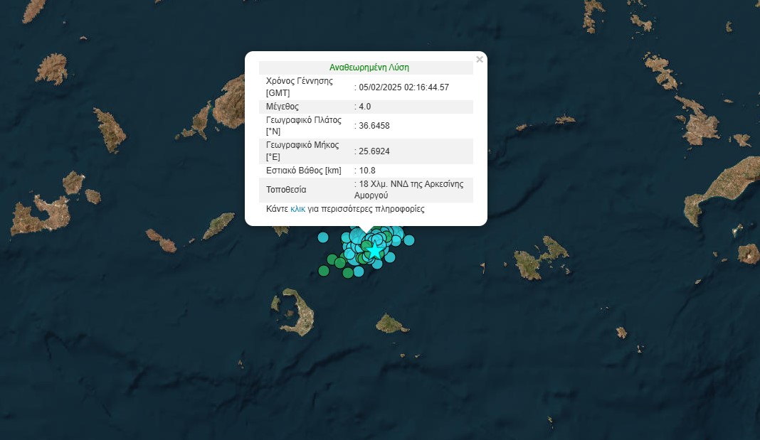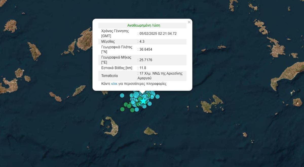 Ο δεύτερος στα 4,3 Ρίχτερ σημειώθηκε στις 04:21 με επίκεντρο 17 Χλμ. ΝΝΔ της Αρκεσίνης Αμοργού και εστιακό βάθος 11,8 χλμ