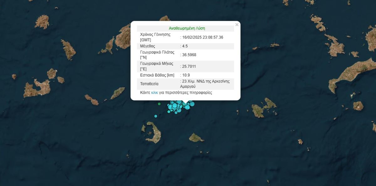 Στη 01:08 καταγράφτηκε σεισμός μεγέθους 4,5 βαθμών της κλίμακας Ρίχτερ 23 χιλιόμετρα νότια-νοτιοδυτικά της Αρκεσίνης Αμοργού και χθες Κυριακή στις 22:55 σεισμός 4,2 βαθμών 18 χιλιόμετρα νότια-νοτιοδυτικά της ίδιας κοινότητας, κατά την πηγή αυτή.