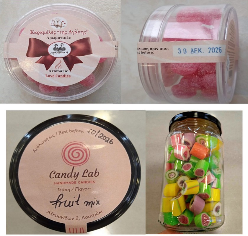 Καραμέλες «fruit mix» με ημερομηνία ανάλωσης ως 10/2026, συσκευασίας καθαρού βάρους περίπου 230g, το οποίο παράγεται και συσκευάζεται στην Ελλάδα από την «Candy Lab» που εδρεύει στο Λουτράκι Κορινθίας.