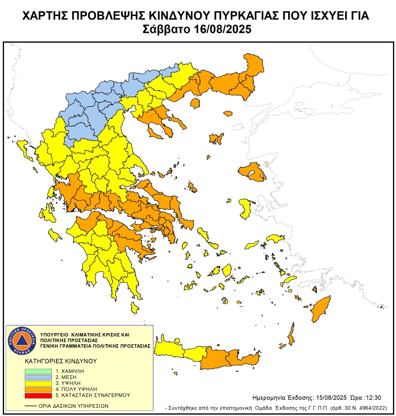 Σύμφωνα με το Χάρτη Πρόβλεψης Κινδύνου Πυρκαγιάς που εκδίδει η Γενική Γραμματεία Πολιτικής Προστασίας του Υπουργείου Κλιματικής Κρίσης & Πολιτικής Προστασίας (civilprotection.gov.gr), για σήμερα Σάββατο 16 Αυγούστου 2025, προβλέπεται πολύ υψηλός κίνδυνος πυρκαγιάς (κατηγορία κινδύνου 4) για τις εξής περιοχές: