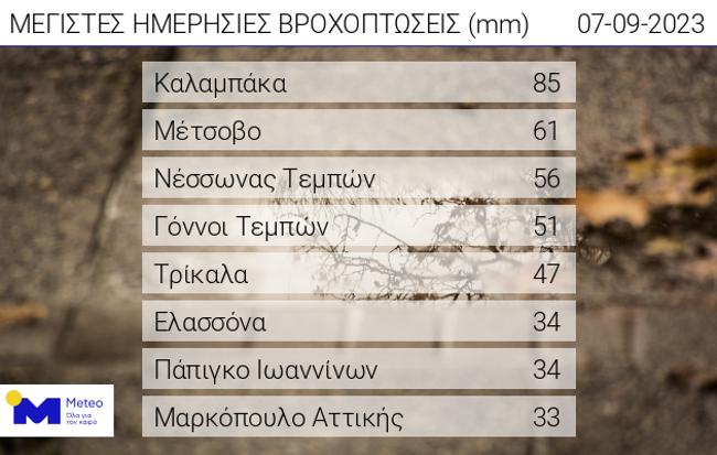 Σύμφωνα με το δίκτυο αυτόματων μετεωρολογικών σταθμών του Εθνικού Αστεροσκοπείου Αθηνών / meteo.gr το μεγαλύτερο ύψος βροχής από τα μεσάνυχτα (00:00) έως τις πρωινές ώρες (08:30) της Πέμπτης 07/09 σημειώθηκε στην Καλαμπάκα με 85 mm, ενώ τα οκτώ μεγαλύτερα ημερήσια ύψη βροχής παρουσιάζονται στον παρακάτω Πίνακα.