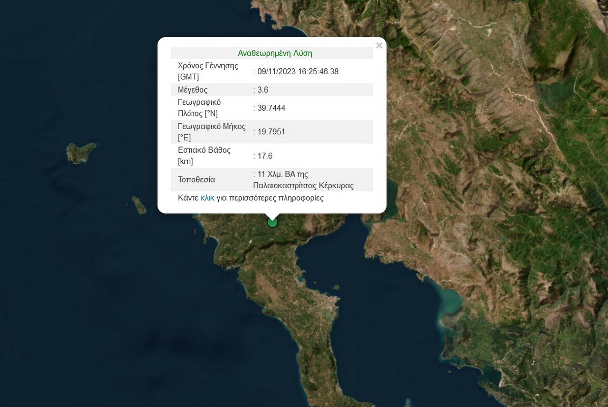 Σεισμός μεγέθους 3,6 βαθμών της κλίμακας Ρίχτερ σημειώθηκε, το απόγευμα της Πέμπτης, στην Κέρκυρα.