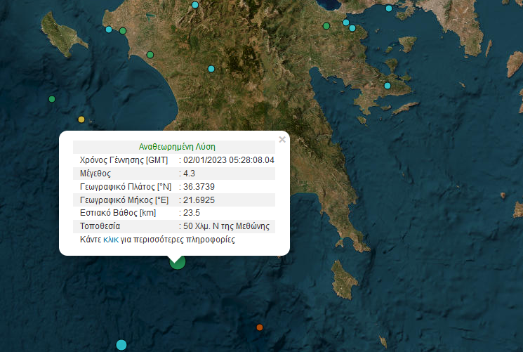 Σύμφωνα με το Γεωδυναμικό Ινστιτούτο, ο σεισμός καταγράφηκε στις 07:28 το πρωί της Δευτέρας στη θαλάσσια περιοχή, 50 χλμ νότια της Μεθώνης.