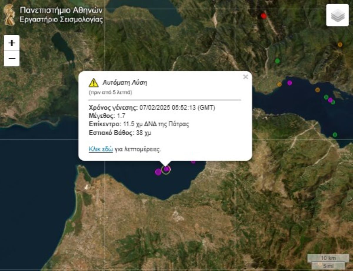 Σεισμική δόνηση έγινε αισθητή, περίπου στις 6:25 το πρωί, σε περιοχές της Αχαΐας, της Ηλείας και της Αιτωλοακαρνανίας.