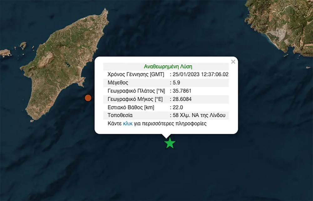 Πιο συγκεκριμένα, σύμφωνα με το Γεωδυναμικό Ινστιτούτο, η δόνηση ήταν 5,9 Ρίχτερ το εστιακό βάθος ήταν 22 χιλιόμετρα και σημειώθηκε στις 14:37 το μεσημέρι της Τετάρτης 58 χιλιόμετρα νοτιοανατολικά της Λίνδου.