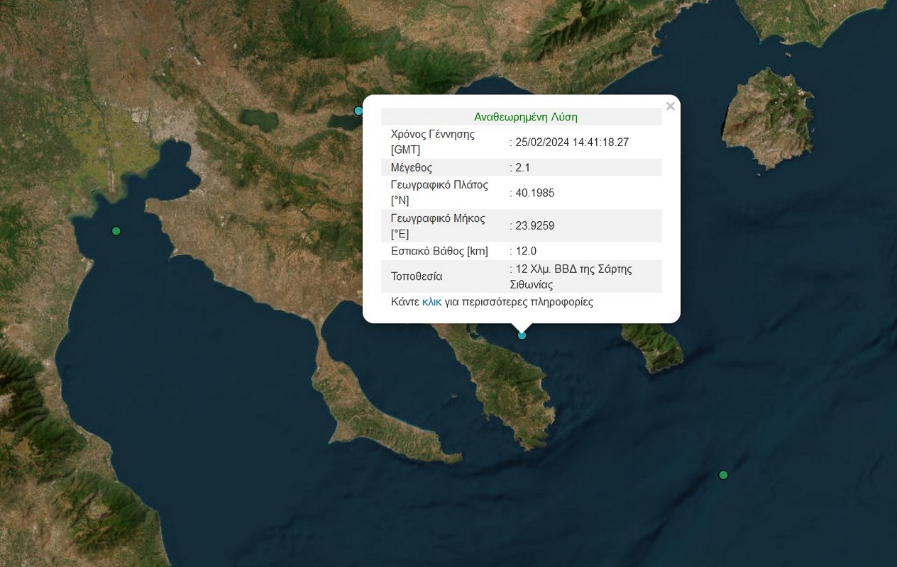 Επιπλέον, η σεισμική δόνηση εντοπίστηκε στα 9 χιλιόμετρα βορειοδυτικά της Σιθωνίας στη θαλάσσια περιοχή, ενώ είχε εστιακό βάθος 13,1 χιλιόμετρα.