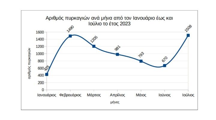 Κατά τους πρώτους επτά μήνες (Ιανουάριος – Ιούλιος) του έτους 2023: • Ο Ιούλιος ήταν ο μήνας με τις περισσότερες αγροτοδασικές πυρκαγιές, με μέσο ημερήσιο αριθμό 49 πυρκαγιές • Ο αριθμός των αγροτοδασικών πυρκαγιών, πλην του 2022, ήταν για το ίδιο διάστημα ο μεγαλύτερος τουλάχιστον από το 2017 • Οι καμένες εκτάσεις, πλην του 2021, ήταν για το ίδιο διάστημα οι περισσότερες τουλάχιστον από το 2017 • Η δριμύτητα των πυρκαγιών ήταν 78 στρ. / πυρκαγιά (από κάθε πυρκαγιά κάηκαν κατά μέσο αριθμό 78 στρ.) • Ο μέσος αριθμός καμένων εκτάσεων είναι σχεδόν 5/πλάσιος από τον μέσο αριθμό για το ίδιο διάστημα κατά τα έτη 2006 – 2022, παρόλο που η χώρα διαθέτει τον μεγαλύτερο αριθμό εναερίων μέσων αεροπυρόσβεσης (91) συνολικά, εκ των οποίων τα 51 είναι μισθωμένα. • Ο διωκτικός μηχανισμός για το έγκλημα του εμπρησμού δάσους είναι αναποτελεσματικός, αφού μόνον το 1,6% των φερομένων ως δραστών των πράξεων του εμπρησμού (κοινού) και εμπρησμού δάσους είτε με πρόθεση είτε από αμέλεια έχουν συλληφθεί στα όρια του αυτοφώρου. • Ο μέσος ημερήσιος αριθμός 32 αγροτοδασικών πυρκαγιών κατά τους τρεις μήνες της τρέχουσας αντιπυρικής περιόδου ήταν ο μισός του αντίστοιχου μέσου αριθμού της τελευταίας 15/ετίας. • Το φαινόμενο των αναζωπυρώσεων ήταν χαρακτηριστικό γνώρισμα που παρατηρήθηκε κυρίως σε ορισμένες εκ των καταστροφικότερων πυρκαγιών όπως λχ της Ρόδου, των Δερβενοχωρίων, της Κέρκυρας, του Βελεστίνου Μαγνησίας. • Η Ελλάδα κατατάσσεται στη 2η θέση μεταξύ των κρατών της ΕΕ καθώς επίσης και της Μεσογείου με τις περισσότερες καμένες εκτάσεις και στην 7η θέση με τις περισσότερες δασικές πυρκαγιές.