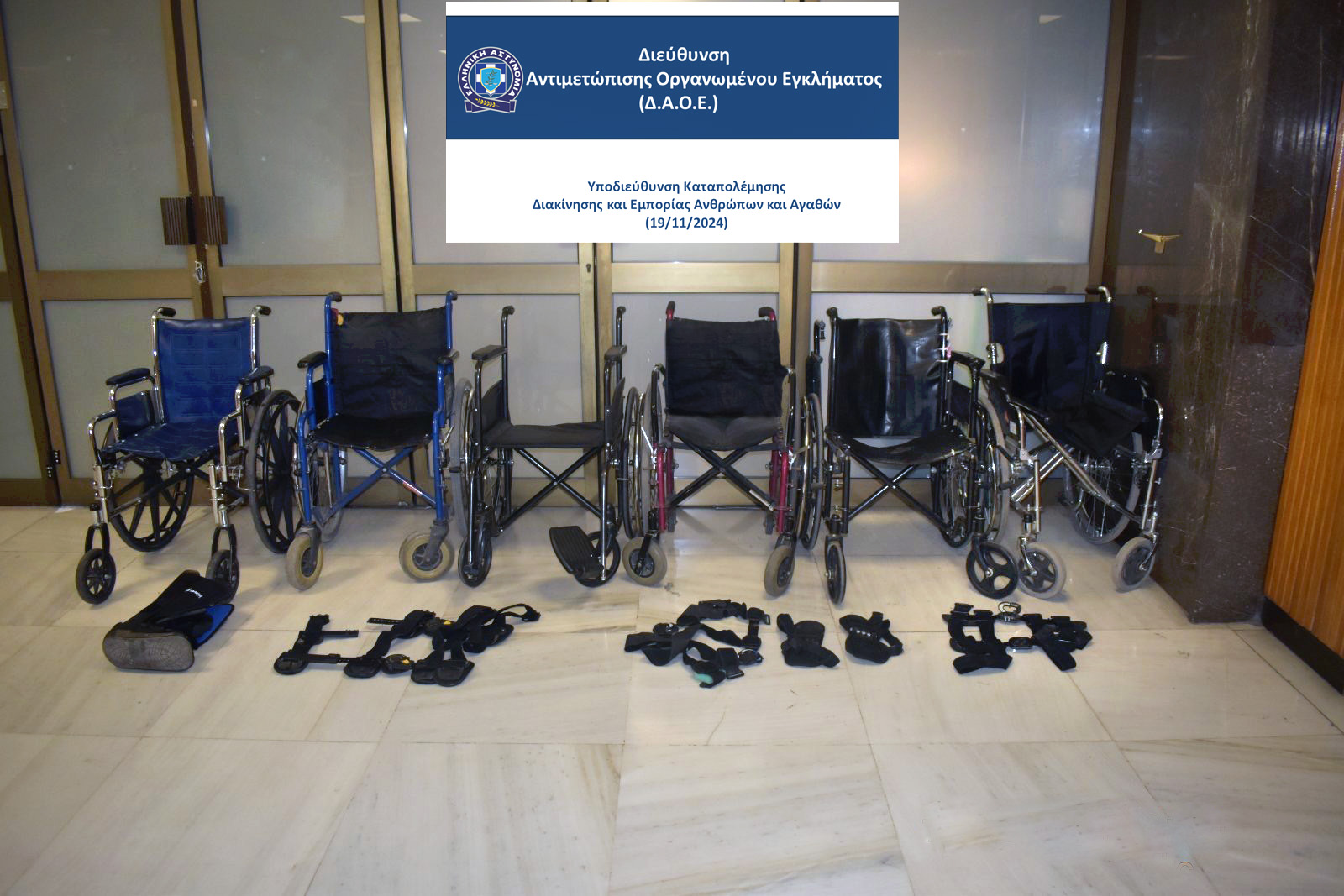 Παράλληλα, στο πλαίσιο της επιχείρησης που πραγματοποιήθηκε, εντοπίστηκαν εντός του οικήματος -4- θύματα της οργάνωσης, στα οποία παρασχέθηκε αρωγή και προστασία, σε συνεργασία με εξειδικευμένες Μ.Κ.Ο. Από τις έρευνες που πραγματοποιήθηκαν, συνολικά βρέθηκαν και κατασχέθηκαν: • -3- οχήματα, • -6- αναπηρικά αμαξίδια, • ορθοπεδικά βοηθήματα υποστήριξης, • -980- ευρώ και • κινητά τηλέφωνα. Οι συλληφθέντες οδηγήθηκαν στην αρμόδια εισαγγελική Αρχή.
