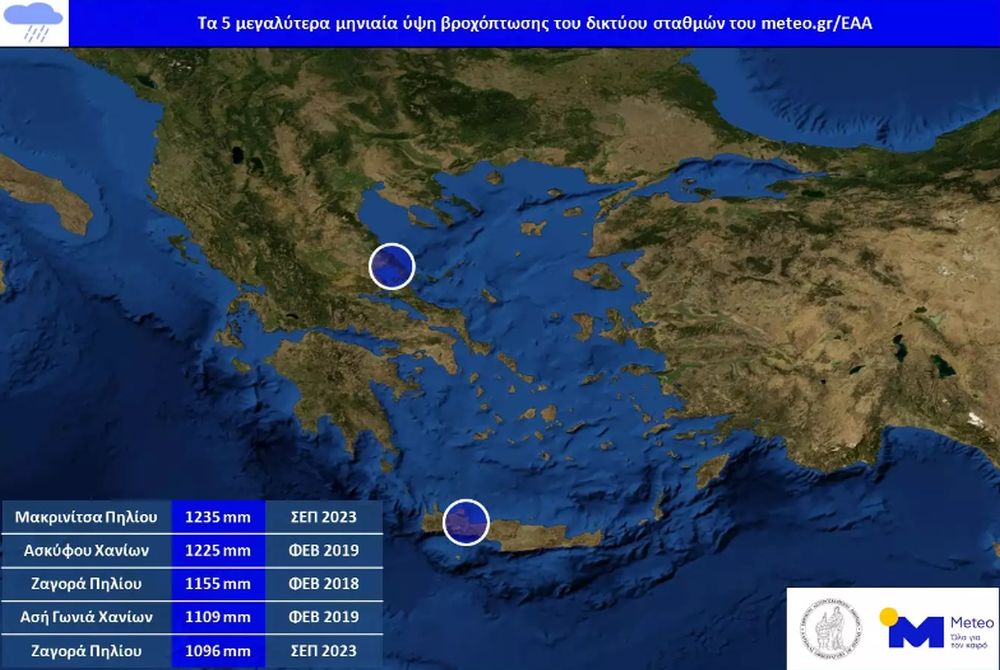 Σύμφωνα με το meteo.gr, ο μετεωρολογικός σταθμός της Μακρινίτσας Πηλίου κατέγραψε μέχρι τις 20 Σεπτεμβρίου 2023 αθροιστικό ύψος βροχόπτωσης 1.235 χιλιοστά, τιμή που αποτελεί το μεγαλύτερο μηνιαίο ύψος βροχόπτωσης που έχει καταγραφεί ποτέ στην Ευρώπη.